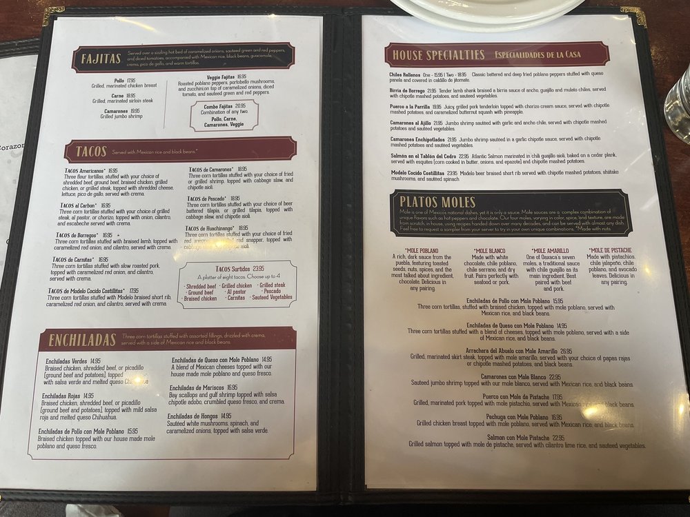 Charbroiled marinated skirt steak served with roasted Poblano potatoes and black beans, garnished with guacamole, crema and pico de gallo, grilled flat iron steak sauteed with shitake mushrooms and topped with queso chihuahua in oaxacan chile pasilla salsa, served with black bean pozole